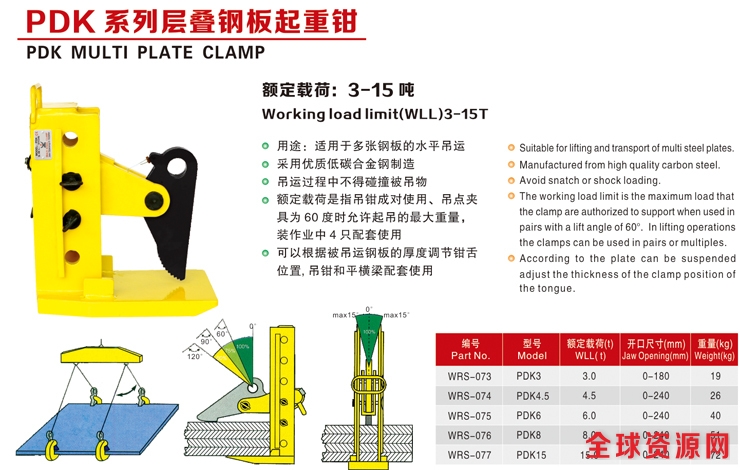 PDK系列层叠钢板吊钳/起重钳特点:额定载荷:3-15